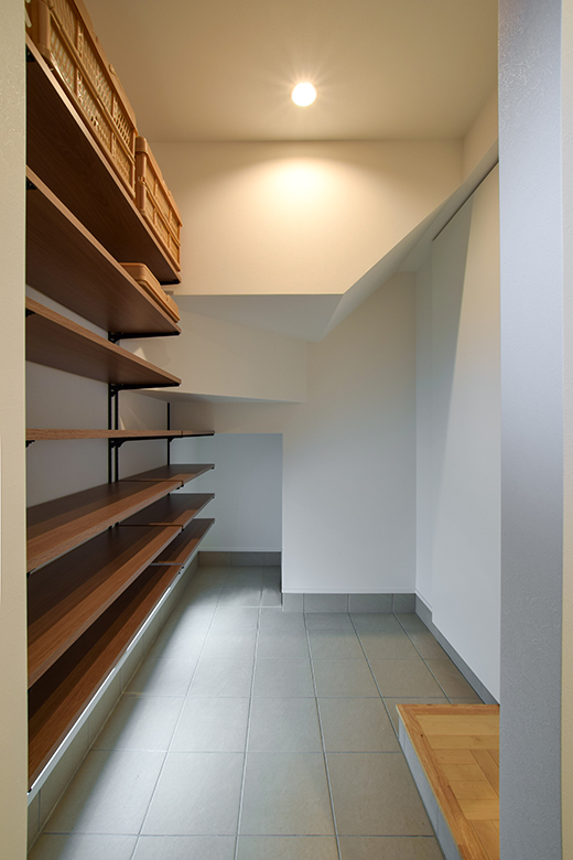 シューズクロークは、オープン棚で収納力を確保。階段下のスペースも有効活用し、無駄のない収納計画を実現