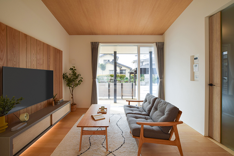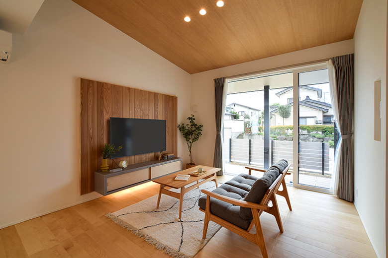 大きな掃き出し窓がテラスへと視線を誘い、屋内外が緩やかにつながる心地よいリビングに。テレビ背面の木パネルが、ナチュラルな温もりを演出