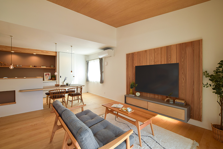 木目を生かしたテレビボードやキッチンのアクセントウォールが、空間に温かみをプラス
