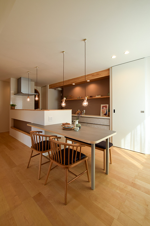 キッチンとつながるダイニングは、ペンダントライトが優しく照らす心地よい空間。壁面のアクセントカラーとオープン棚が、落ち着きのある上質な雰囲気を演出