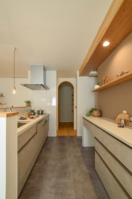 ゆとりある動線を確保したキッチンは、作業のしやすさと収納力を両立。奥にはアーチ開口が印象的なパントリーを配置し、収納力も抜群