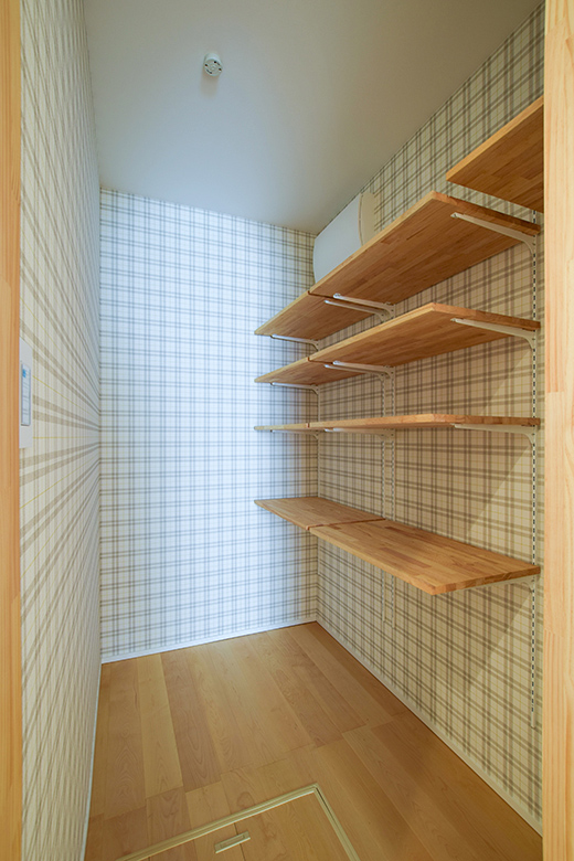 可動棚を設けた広々としたパントリーは、チェック柄のクロスが優しい雰囲気を演出し、家事の時間を心地よく彩る
