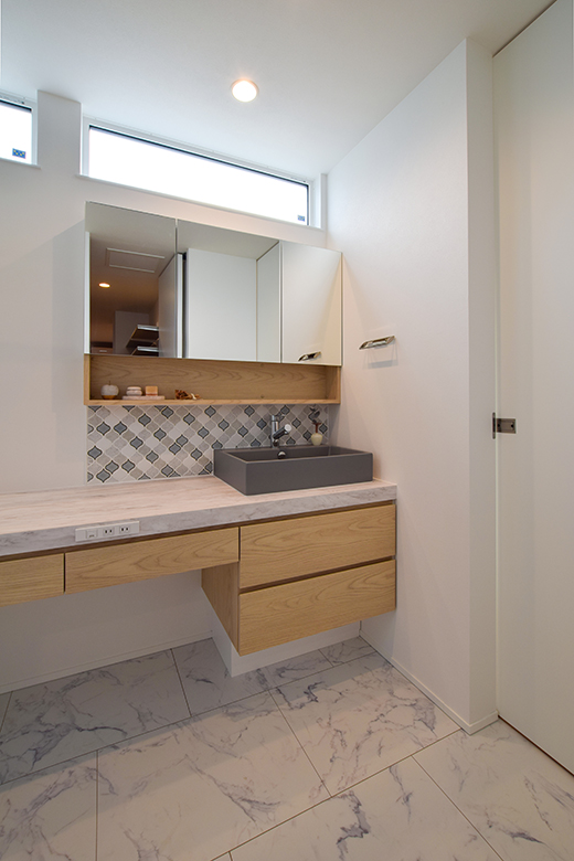 木の温もりと大理石調のカウンターが調和する洗面台。アクセントとなる幾何学模様のタイルが、空間に個性をプラス