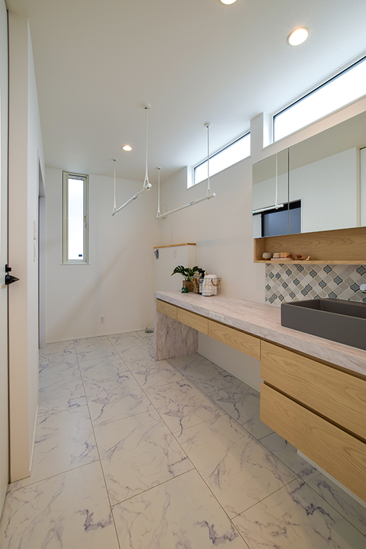 洗面とランドリーを一体化し、使い勝手を重視した設計。動線をスムーズにし、毎日の家事負担を軽減