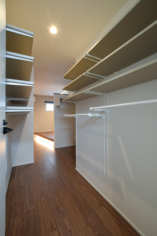 寝室と洗面室をつなぐ動線上に配置した使い勝手の良いウォークスルークローゼット