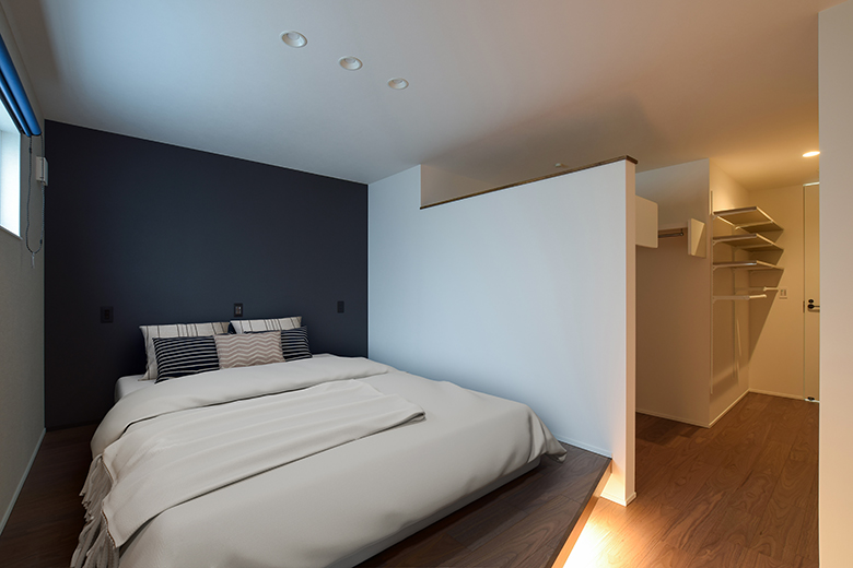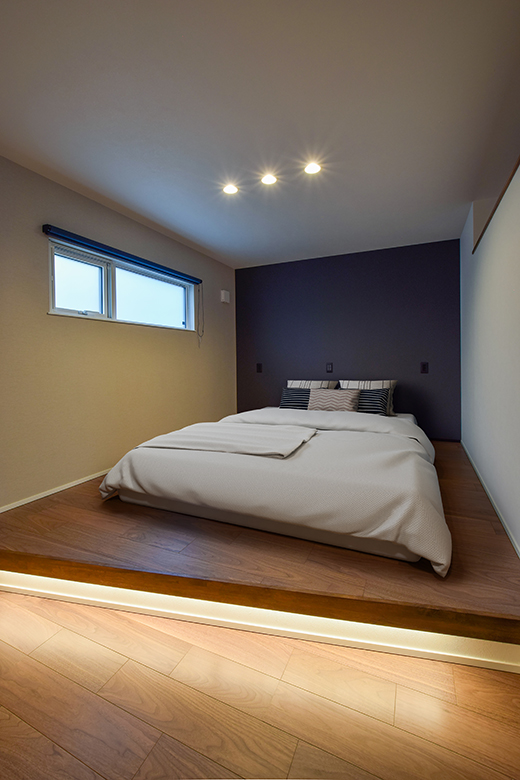 深みのあるアクセントウォールが、落ち着いた眠りを誘う主寝室。足元を柔らかく照らす間接照明が、空間に奥行きを与え、リラックスした雰囲気を演出