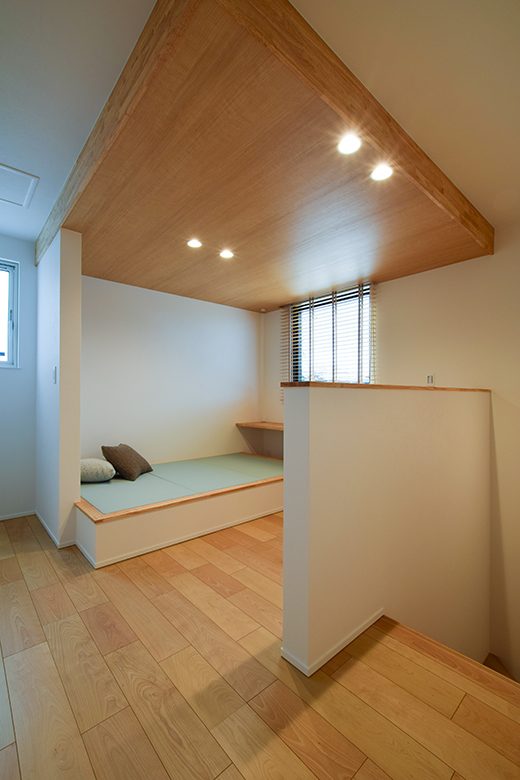 天井を低めに設定し、落ち着いた雰囲気を演出した畳コーナー。程よく区切られた空間が、読書や昼寝などのくつろぎ時間に最適
