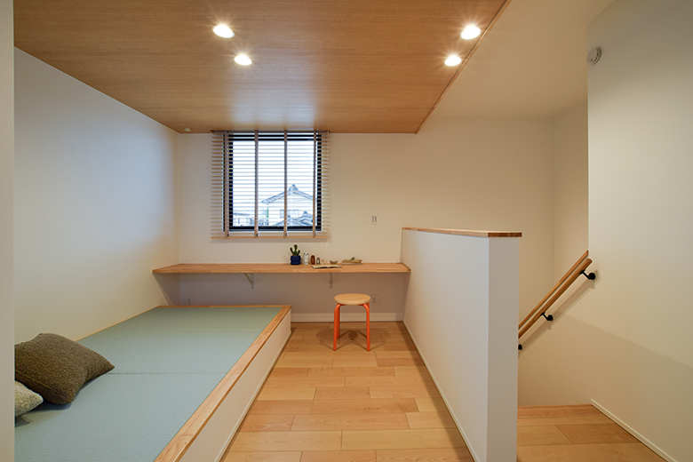 畳コーナーの窓際にはカウンターを設け、ちょっとした作業や勉強ができるワークスペースに。家族が自由に使える、多目的なスペース
