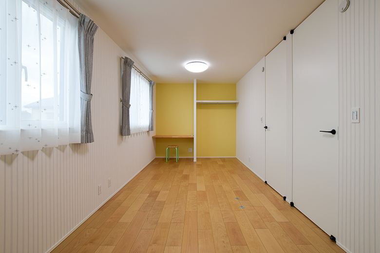 将来の変化に対応できる、可変性のある子ども部屋。イエローのアクセントクロスが、明るく元気な雰囲気を演出