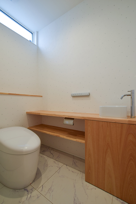 木の風合いを生かした造作カウンターが、温かみのある雰囲気を演出したトイレ空間