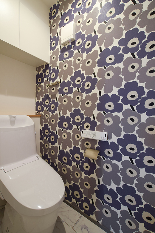 大柄のフラワーモチーフが印象的なアクセントクロスを採用したこだわりのトイレ空間