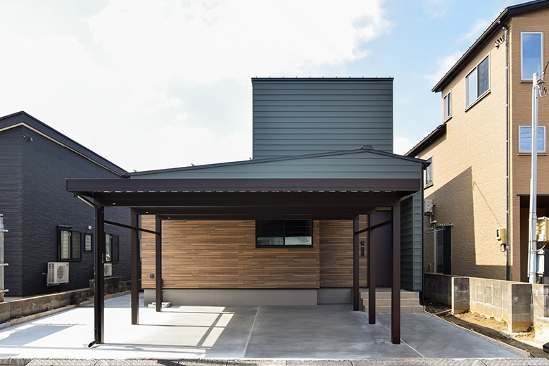 グリーンのガルバリウム鋼板と木目調の窯業系サイディングを組み合わせた外観