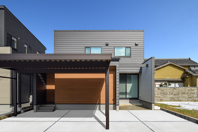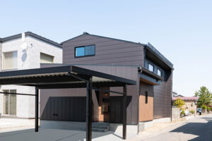 黒のガルバリウム鋼板をベースに、1階部分に木目調の窯業系サイディングを使って温かみを加えた外観