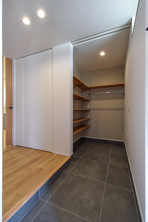 シューズクローゼットはロールスクリーンで隠せる設計。隣接して白い扉の収納スペースもあり、圧迫感なく充実した収納量を実現