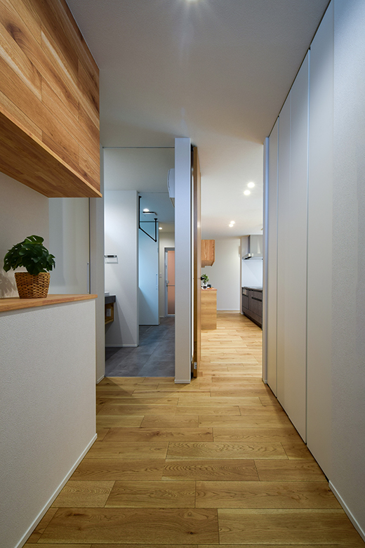 ホールからリビングに向かうと二手に分かれ、右側はLDK、左側は洗面や脱衣室の水回り動線へつながる