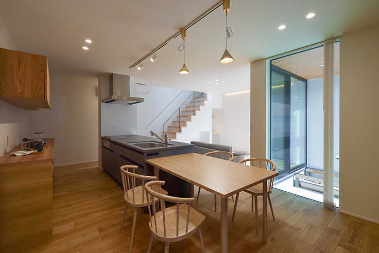 L字型の大開口で庭とつながるLDKは明るく開放的。木目の吊り戸と石目調のキッチンが、上質でスタイリッシュな空間を作り出す