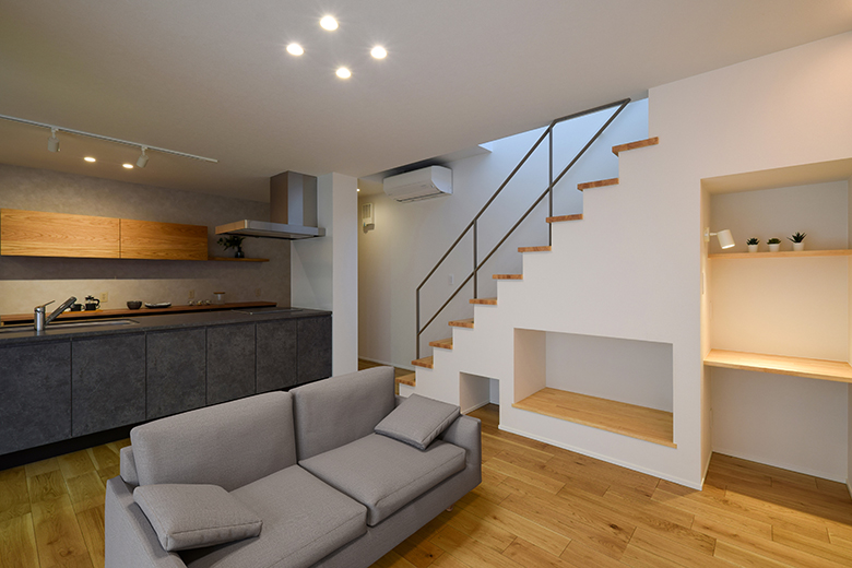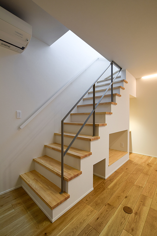 階段を登ってすぐの場所に造作収納を設置。上部は木の優しい風合いを感じられるカウンター、下部は開き扉の収納スペースで空間を無駄なく活用