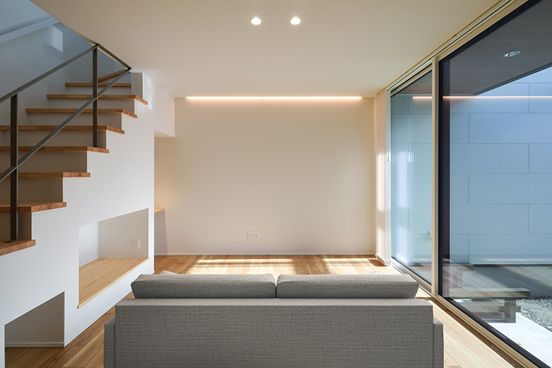 南向きの大開口からはたっぷりと自然光を取り入れ、夜は間接照明の柔らかい明かりを楽しめるリビング