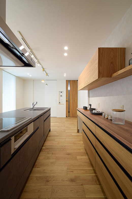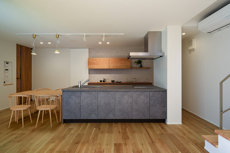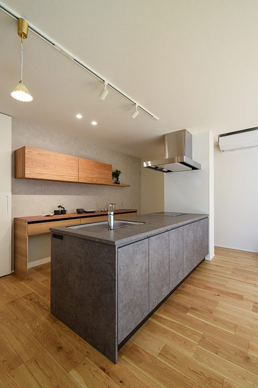 モルタル調の質感と天然木の温もりが、落ち着きと高級感を演出。毎日の料理が特別な時間になる空間デザイン