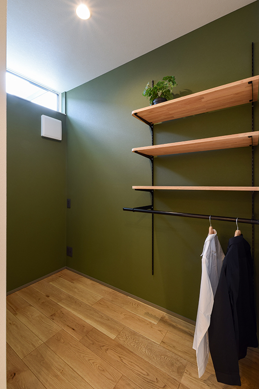 癒しを感じるグリーンの壁紙を使った書斎。造作棚やパイプハンガーも備え、多目的に使える