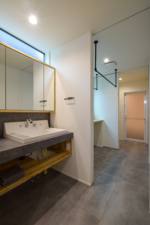 浴室・脱衣室と一直線でつながった洗面室。ここもグレーと木目をバランス良く配置して洗練された印象を与える