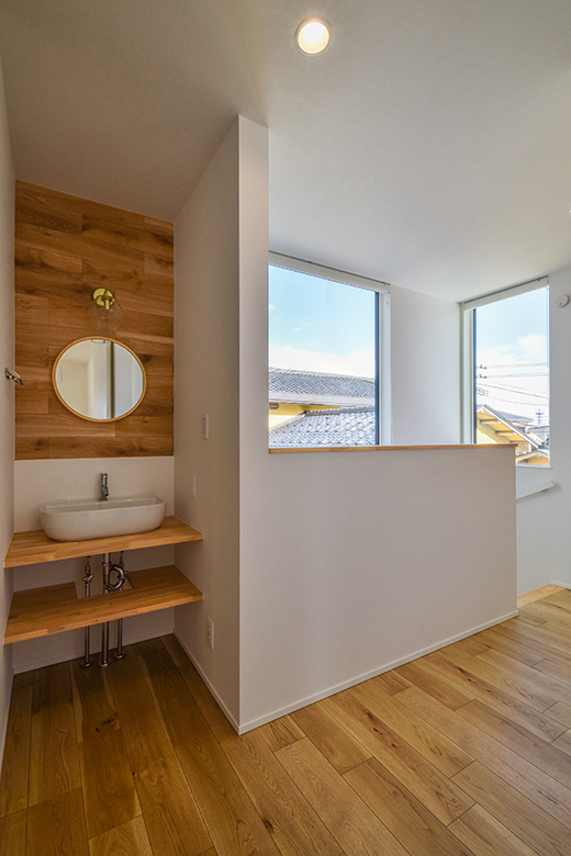 2階ホールにおしゃれな洗面スペースを設置。トイレ後の手洗いとしてはもちろん、掃除の水汲みや1階の混雑対策にも便利