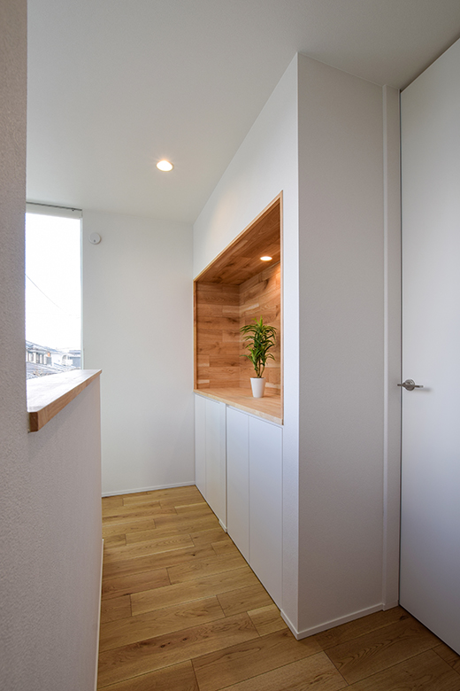玄関ホールにも木目の温かさを感じられる造作棚を設置。カウンターには雑貨や小物を並べ、下にはスリッパなどを収納できる