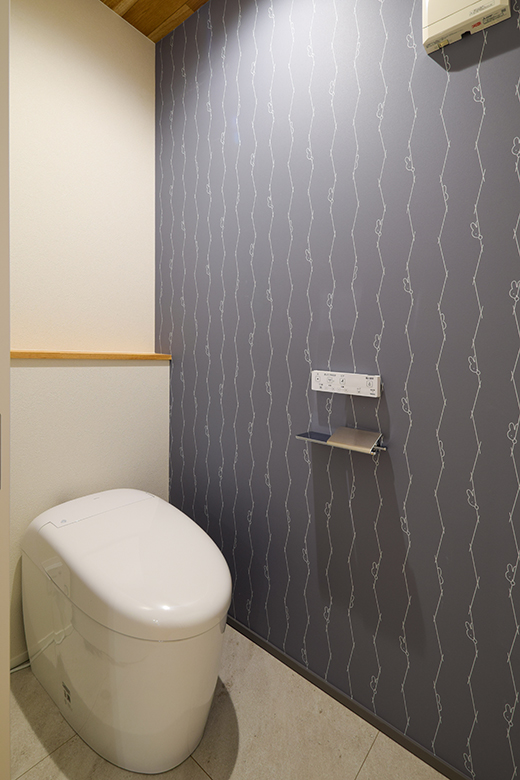 1階トイレは片側にキャラクターをあしらったアクセントクロスを貼り、優しくかわいい印象に
