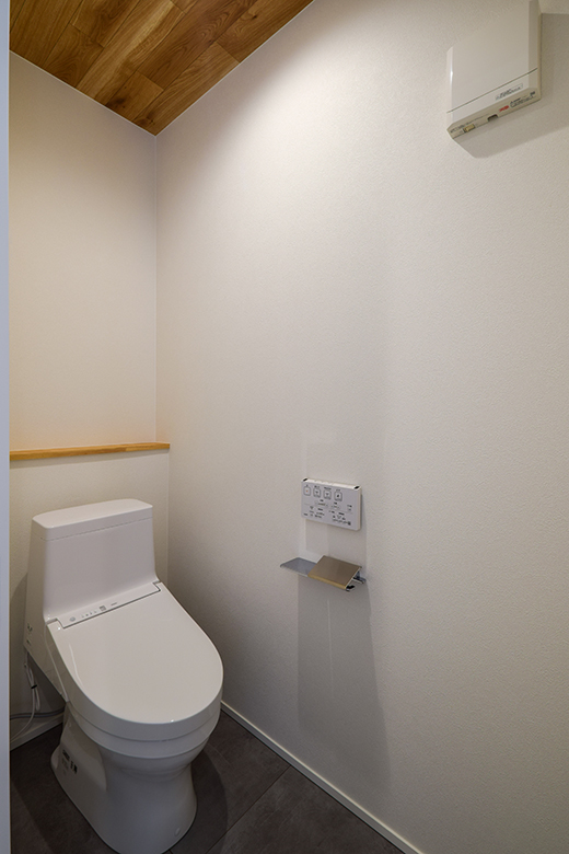 2階トイレは白ベースのシンプルな仕上がり。天井は板張りにして落ち着ける空間に