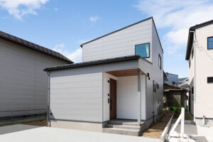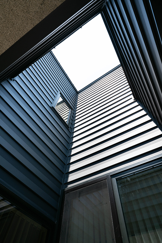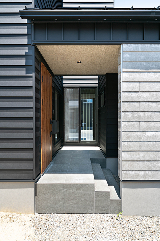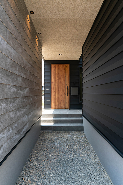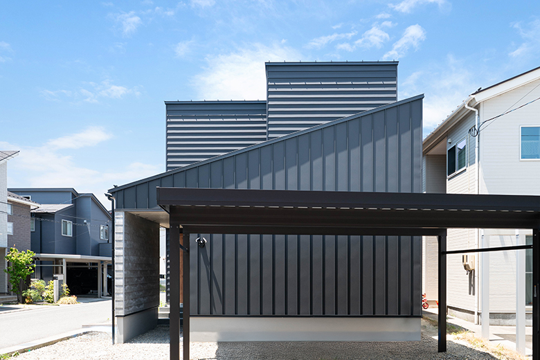 同素材・同色で統一しながら、1階は縦張り、2階は横張りに。外壁の“折り方”を変えることで、奥行きある表情を生み出した