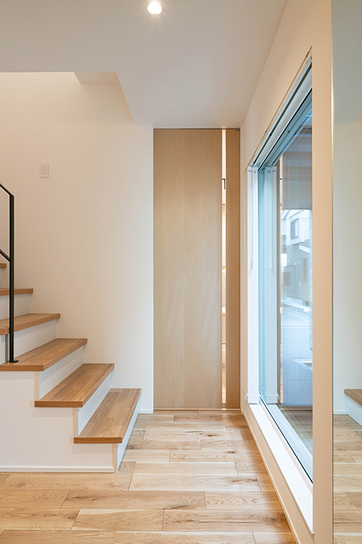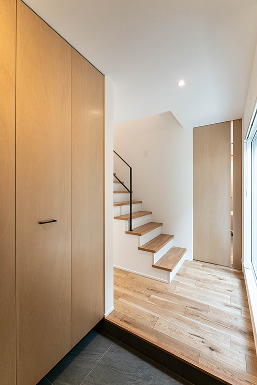 ナチュラルな木の色味で心地よく出迎え。やわらかな光と素材のぬくもりが、家に帰るたびほっとする空間