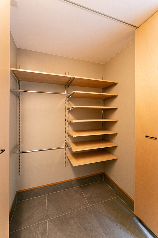 玄関収納は奥行き広めで、ゆとりのある設計に。可動棚に加え、コート掛けスペースも備えている