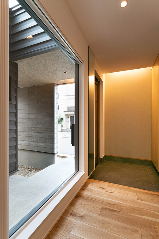 柔らかな間接照明が空間に奥行きをもたらし、訪れる人をやさしく迎える上品な玄関。靴を履いて身だしなみの最終チェックを♪