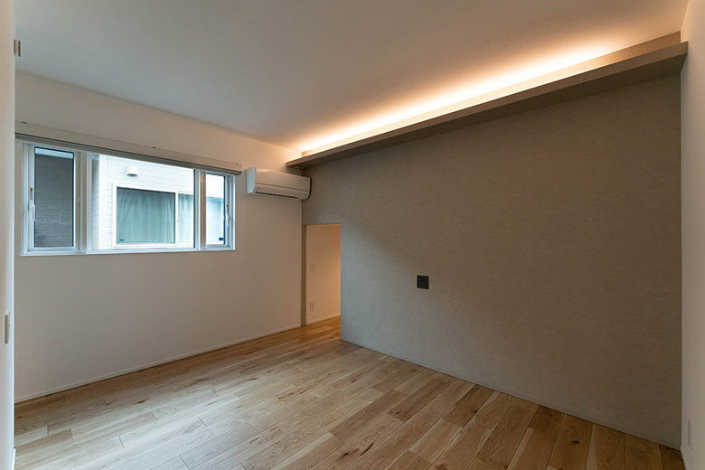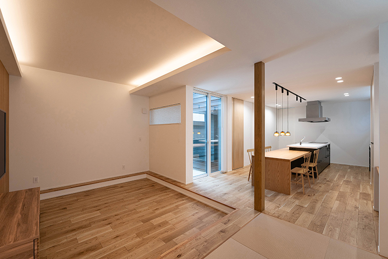陰影を楽しむ照明計画で、空間に豊かな表情をプラス。リビングはあえて間接照明のみとし、やすらぎのひとときを静かに包み込む、落ち着いた雰囲気に仕上げた