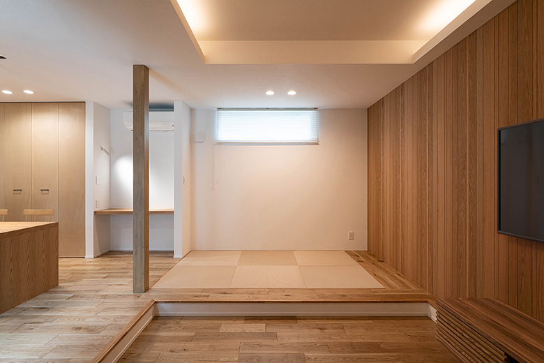 小上がりの畳スペース。ダウンフロアにすることにより、ちょっとした腰掛が誕生。リビング・和室・ダイニングそれぞれからテレビを見られる