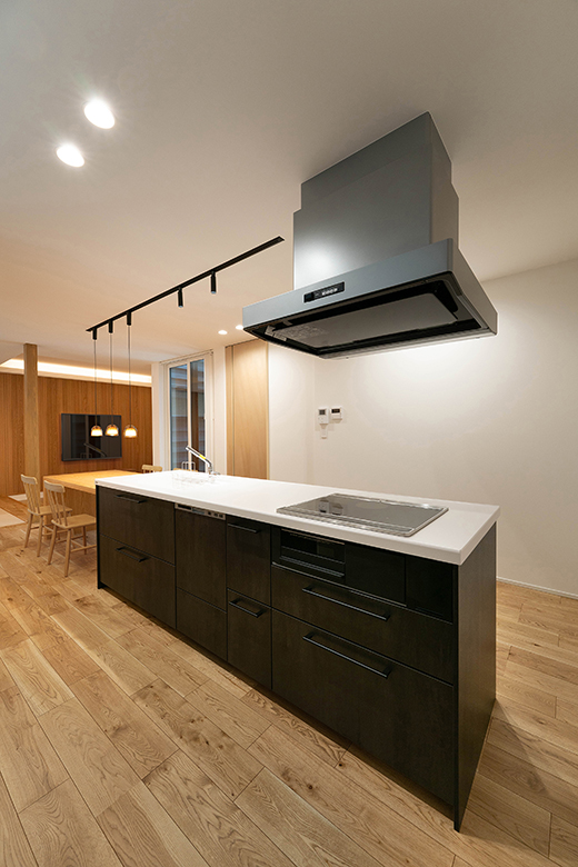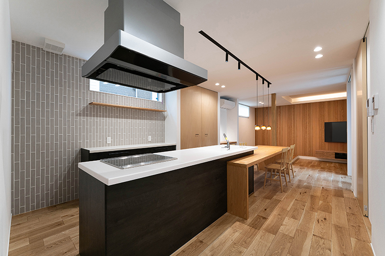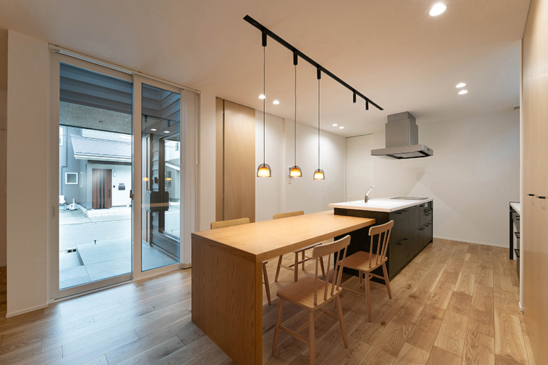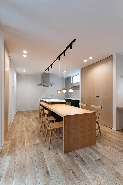 キッチンに一体化させた造作のダイニングテーブル。空間に統一感をもたらすデザインで、暮らしの中心にふさわしい存在感