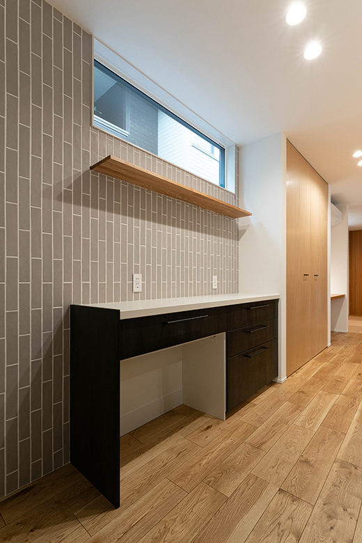 キッチン背面には縦ラインが美しいグレータイルを採用。シンプルながらも上品な表情を持ち、空間全体に程よいアクセントと洗練された雰囲気をプラス