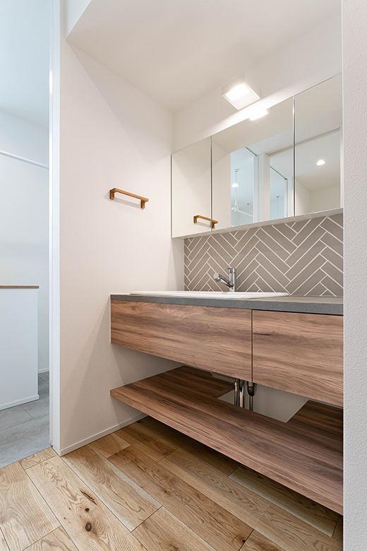 木目の美しい造作洗面台に、ヘリンボーン貼りのグレータイルがアクセント。素材感とデザイン性を両立させた、毎日の身支度が楽しくなる空間