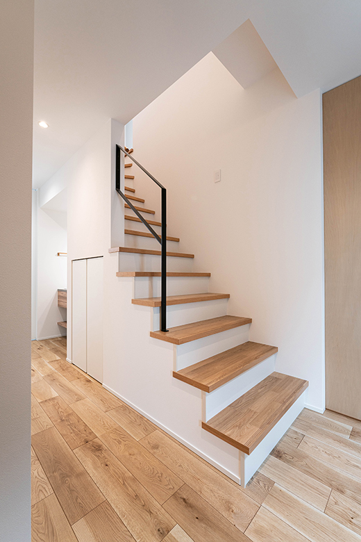 木の温もりとアイアン手すりを組み合わせた階段。段下のスペースも有効活用