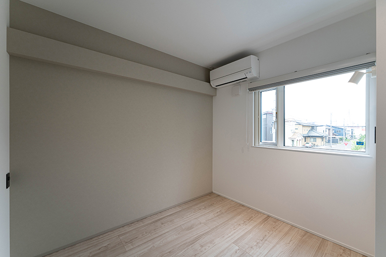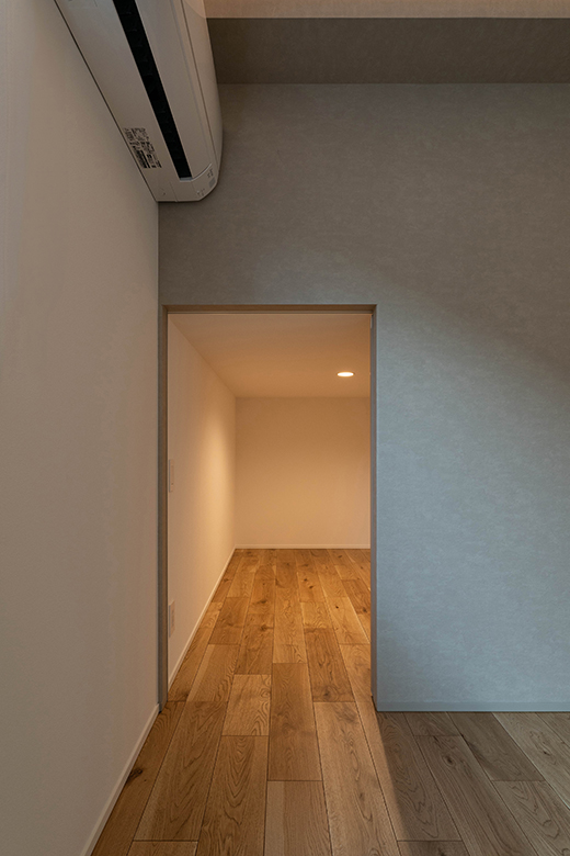 グレーのアクセントクロスと間接照明で落ち着いた雰囲気に仕上げた寝室。奥には秘密基地チックな小屋裏収納が