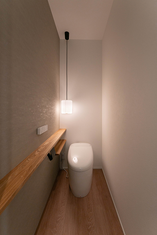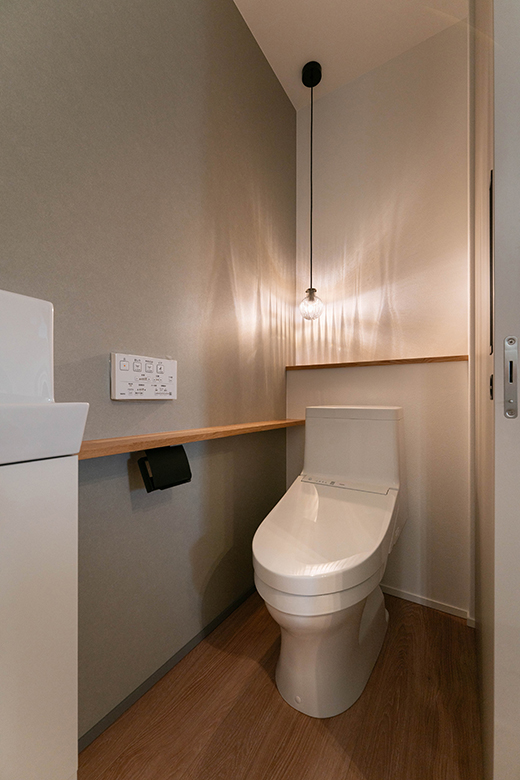 お菓子のカヌレを思わせる和紙のペンダント照明が印象的なトイレ。グレージュのアクセントクロスと木のカウンターで、落ち着きと温もりを感じる空間に