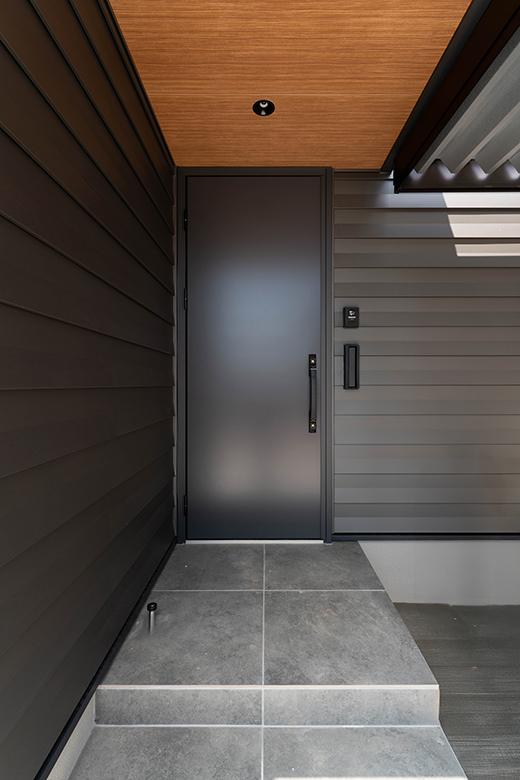 黒を基調とする中で軒天を木目調にしてアクセントを効かせた玄関ポーチ