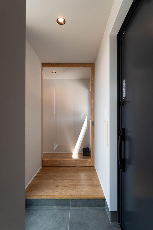 木枠を使った造作のリビングドアが印象的な玄関ホール。アクリルガラスを使い、窓から差し込む光を効果的に取り込める