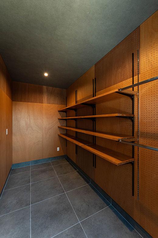 可動棚とパイプハンガーを一直線に配置した大容量のシューズクローゼット。壁に有孔ベニヤを貼り、帽子や小物を掛けるなどディスプレイも楽しめる