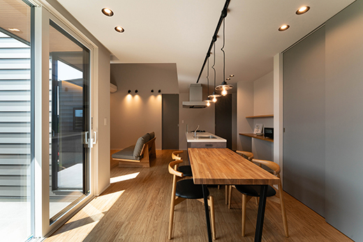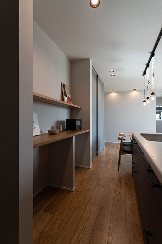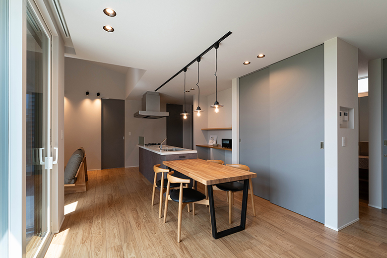 木目×グレーで統一したLDKは、落ち着きと温かみのある大人の空間。ペンダント照明とダウンライトの光が、ダイニングとキッチンに上質な陰影をつくり出す