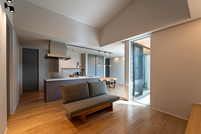 内装はオークとグレーでシンプルにまとめ、明るさと心地よさを両立した空間。