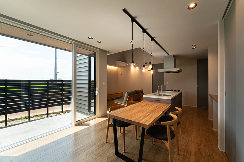 キッチンの幅に合わせて造作されたダイニングテーブル。目の前に広がる大開口から中庭のテラスにつながる