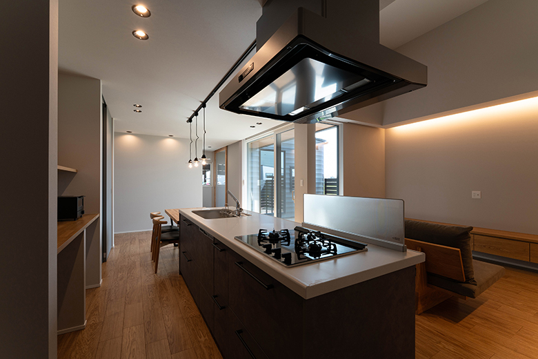 LDKの中心に配置し、リビングやダイニングを見渡せるアイランドキッチン。回遊動線で家事を効率的にこなせる