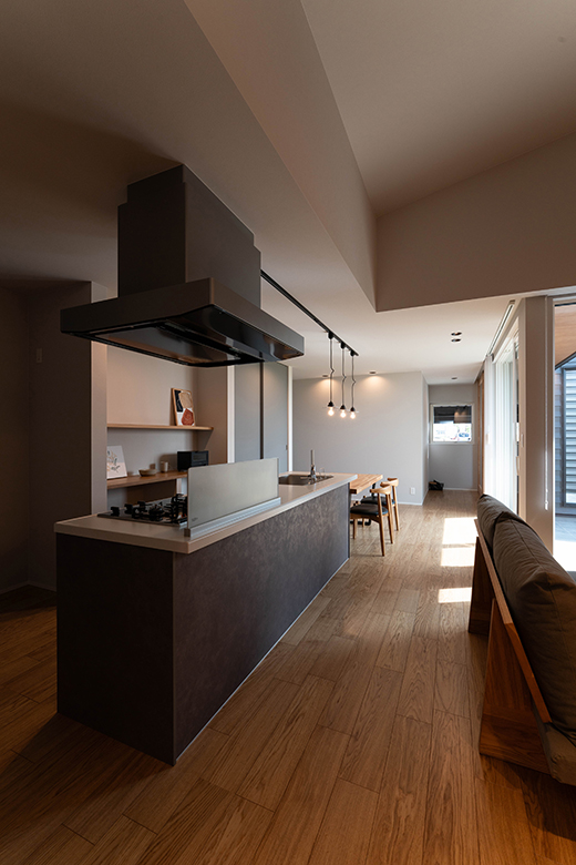 天井の折り上げによる立体的なラインが、空間にメリハリと奥行きをプラス。ダークトーンのキッチンと木の床が調和し、落ち着きのあるスタイリッシュなLDKを演出