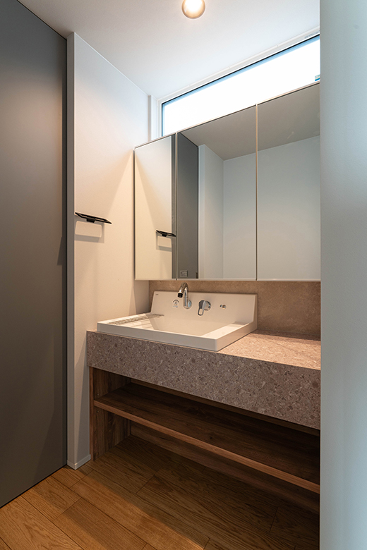 石目柄の化粧板を使った造作の洗面化粧台。高窓から自然光もたっぷり採り入れられる